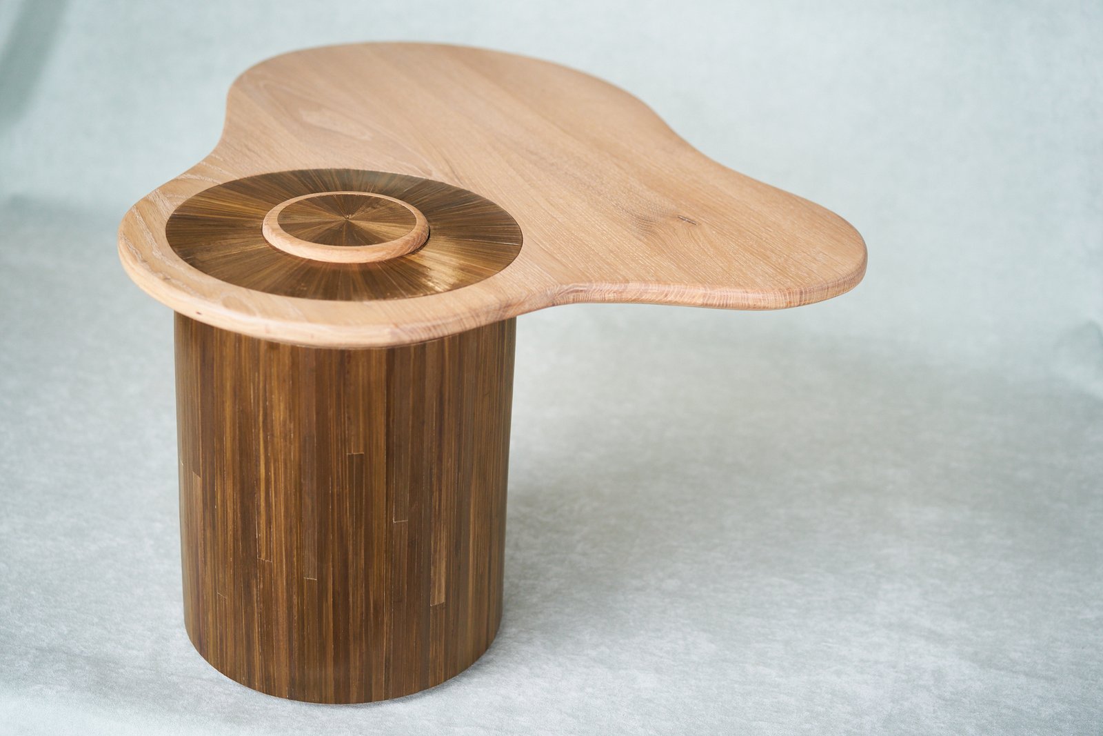 AURA est une table basse, entièrement façonnée dans mon atelier. Le plateau en chêne massif pivote autour d’un axe, révélant une fonctionnalité discrète, au service du quotidien.