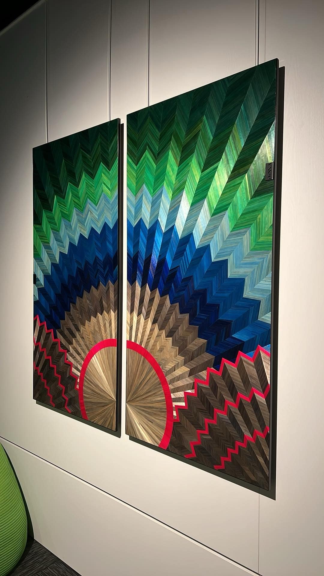 FALA est une composition vibrante, née d’une collaboration artistique. Conçue sur-mesure pour habiller les murs de l’Espace 55, cette pièce inaugure ma première création en marqueterie de paille. Elle mêle graphisme, couleur et lumière, dans une esthétique à la fois contemporaine et sensible.