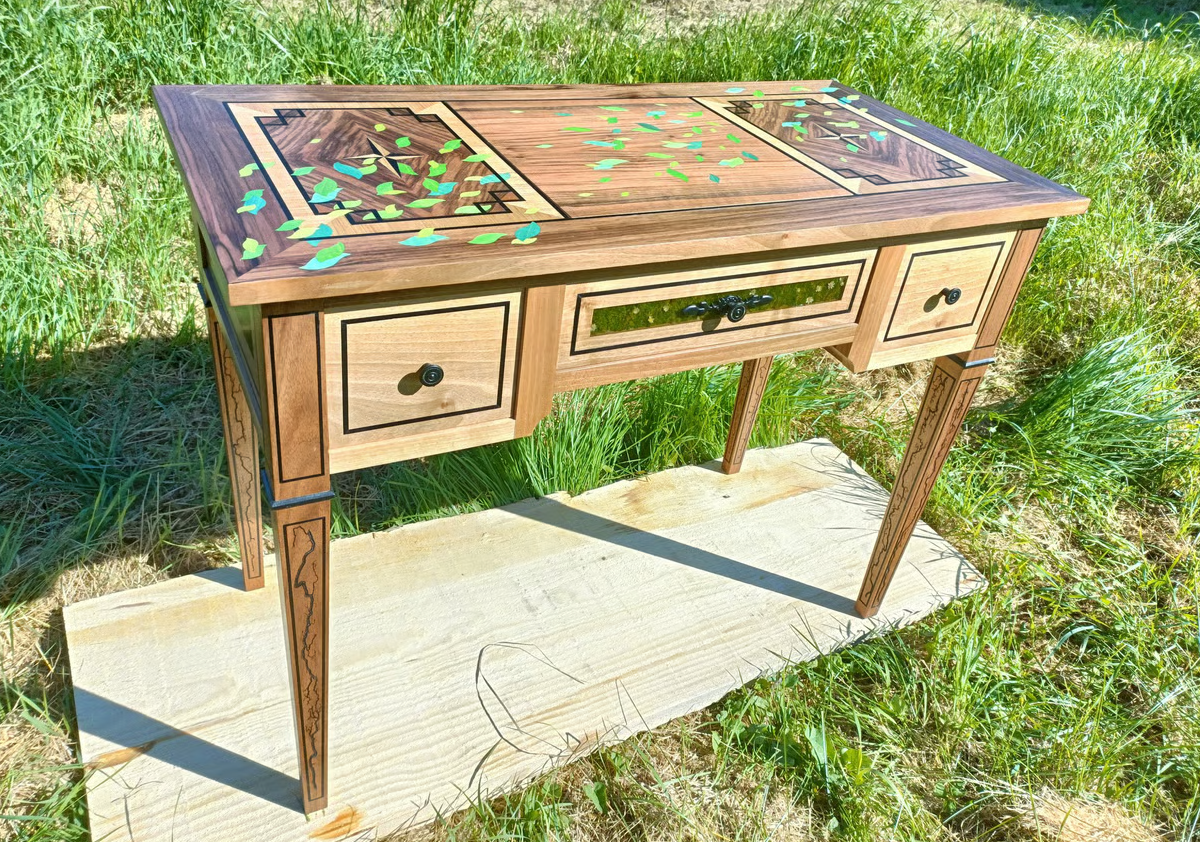 Les tiroirs, eux aussi travaillés avec soin, dévoilent une originalité rare : la façade est ornée de mousse stabilisée, coulée dans une résine translucide, créant un effet à la fois naturel et contemporain. Les finitions soignées, telles que les poignées de tiroirs en métal et les détails gravés sur les pieds, soulignent le caractère unique de ce meuble.